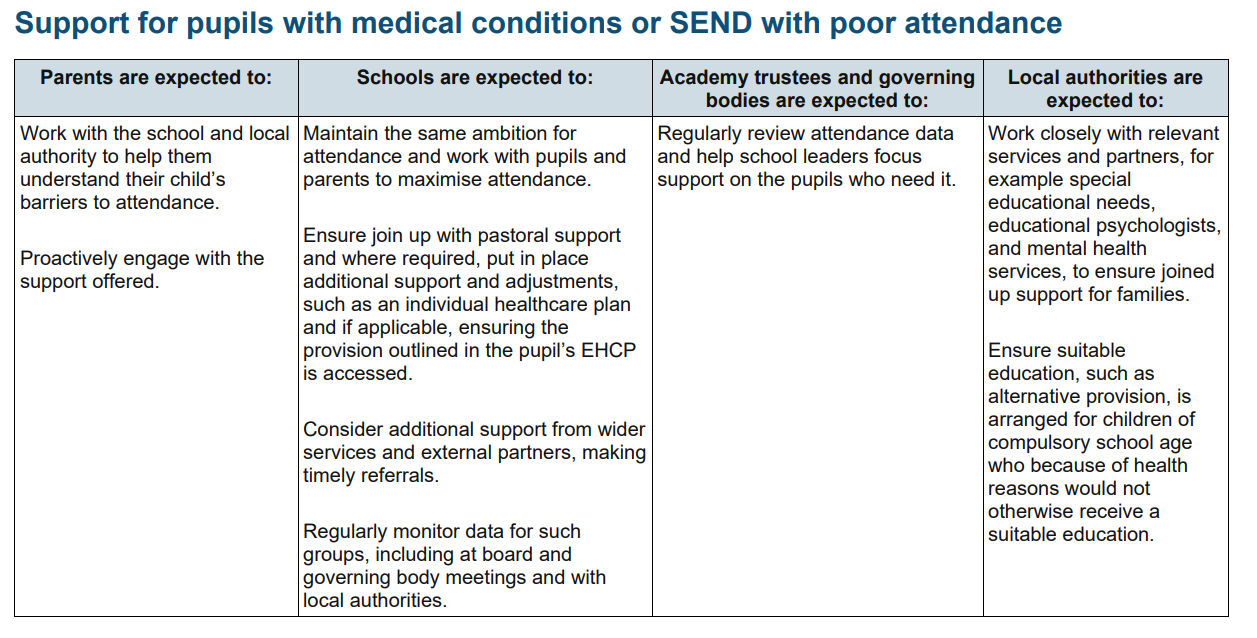 In August 2024, the Department for Education published 'Working Together to Improve School Attendance.' The document includes a summary table that outlines the responsibilities for supporting children with medical conditions or Special Educational Needs and Disabilities (SEND) who have poor attendance. The table below details these expectations.